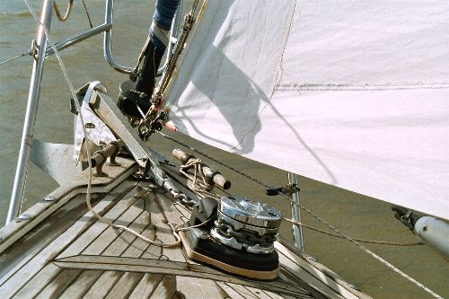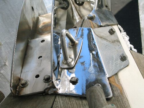 Schloßbolzen zu sehen, die das V4a Gestell für die Ankerwinde halten.